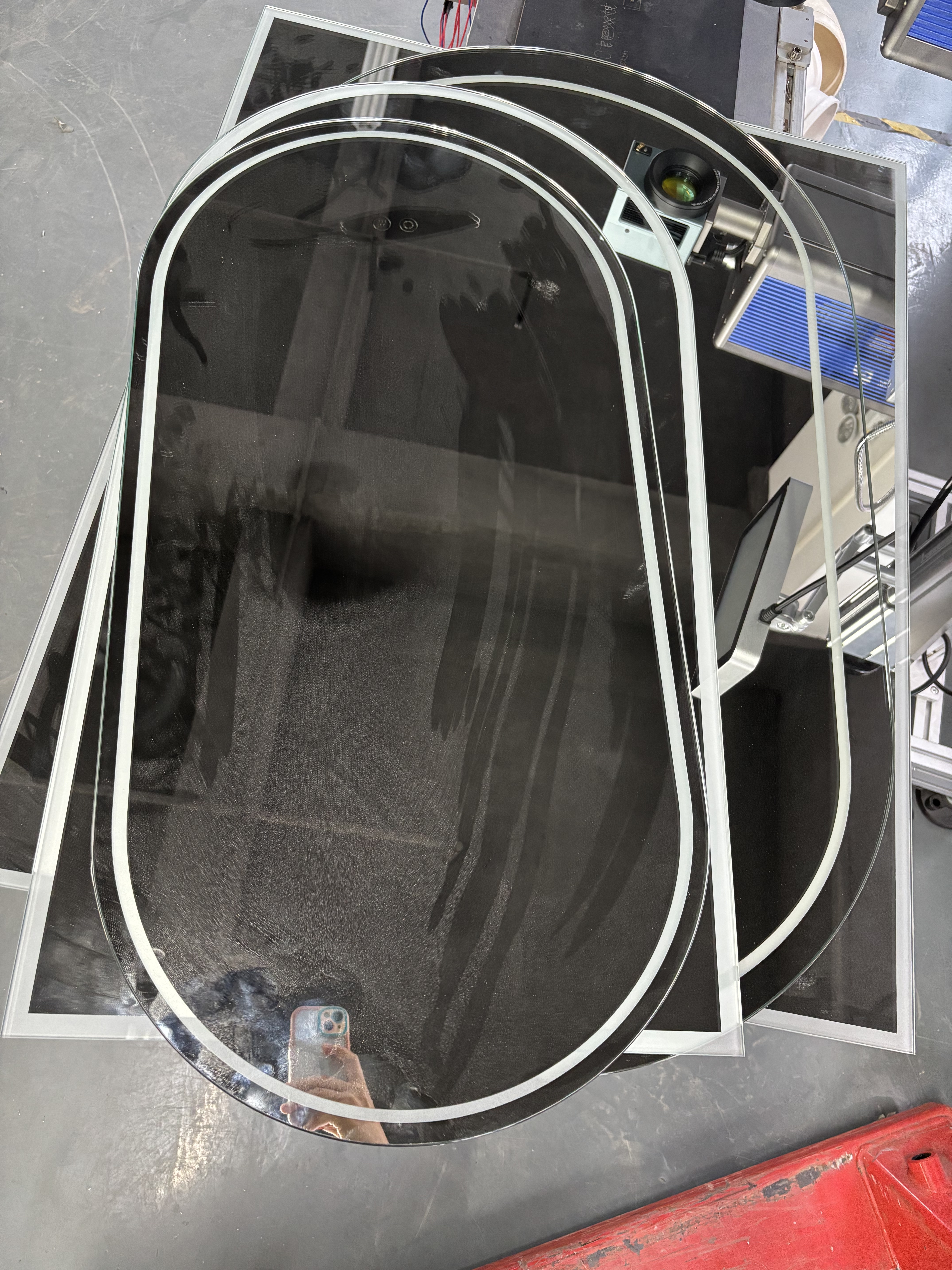 Removes the protective paint layer from smart mirrors or back-painted glass in a single pass, achieving a frosted effect. The process is fast, smooth, and does not damage the mirror or glass surface. Whether silver- or copper-coated, the laser produces a fine, uniform matte finish without burrs.